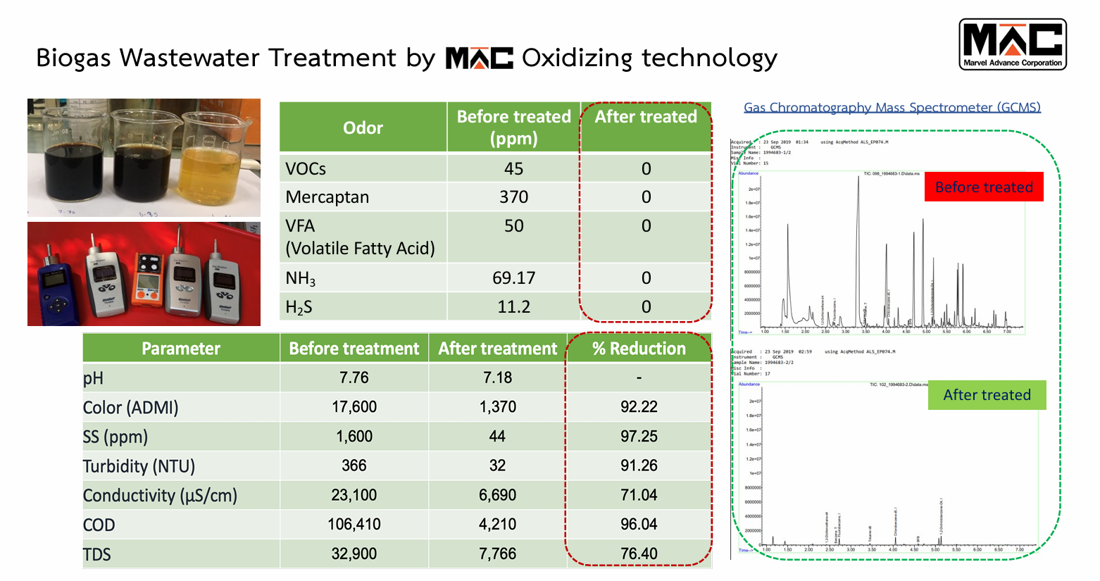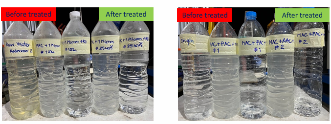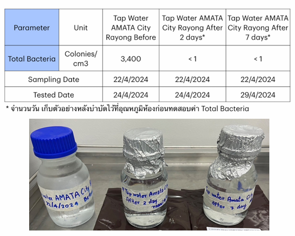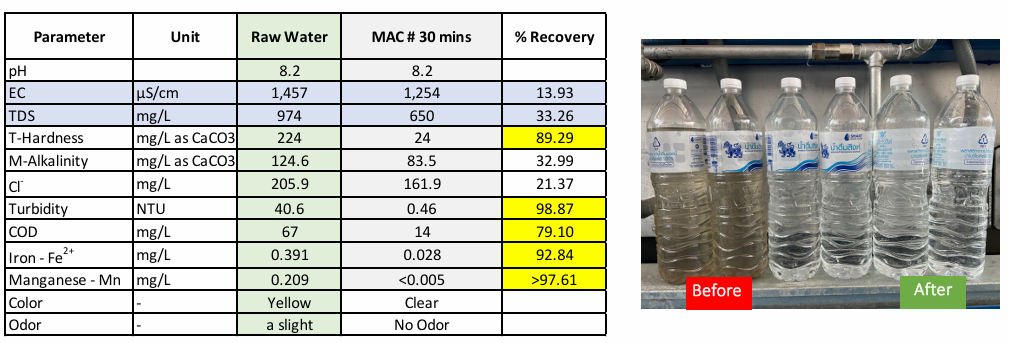 - Reduction of Mn and Fe values from water supplied to the Industrial Estate, Rayong Province from 0.39 ppm > 0.022 ppm.